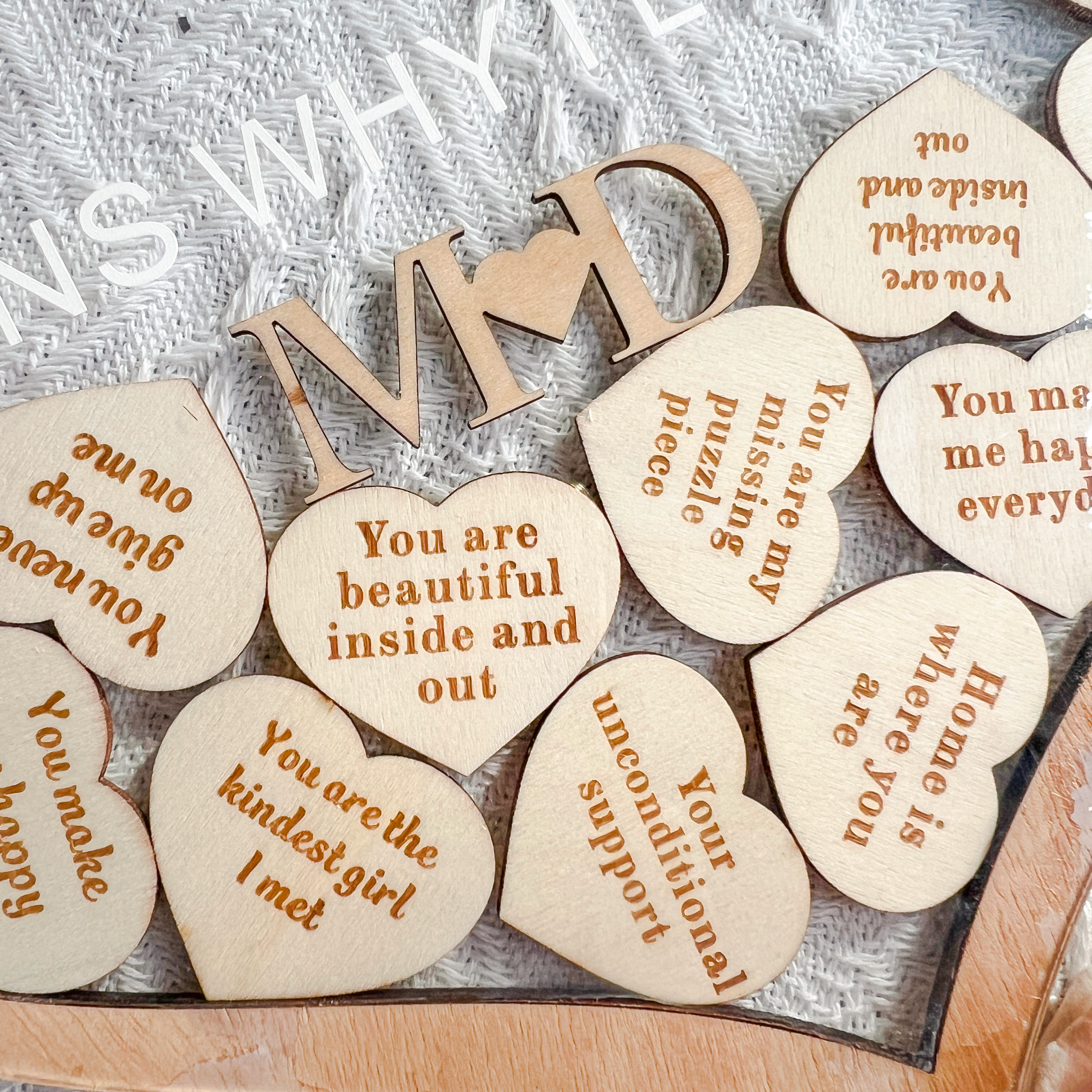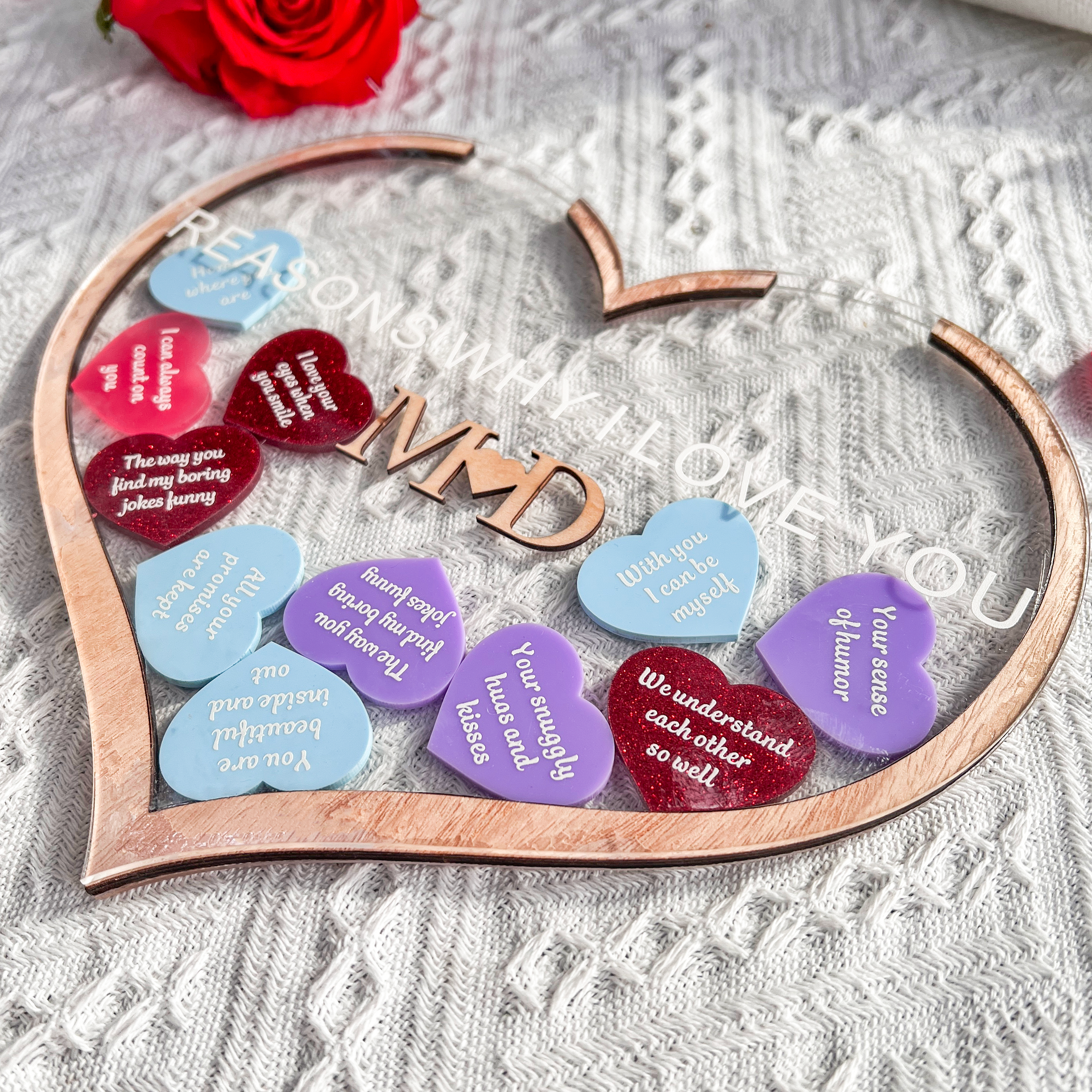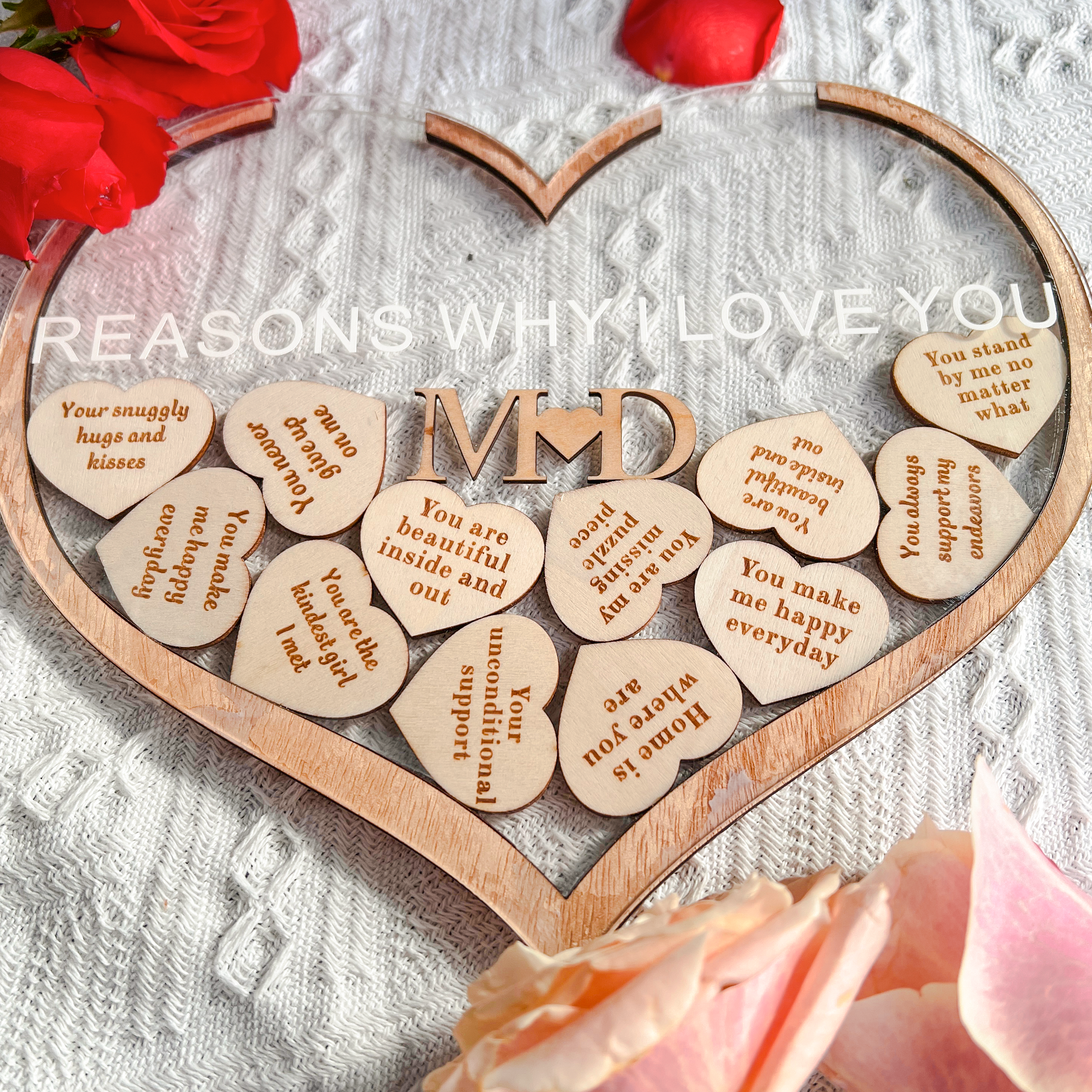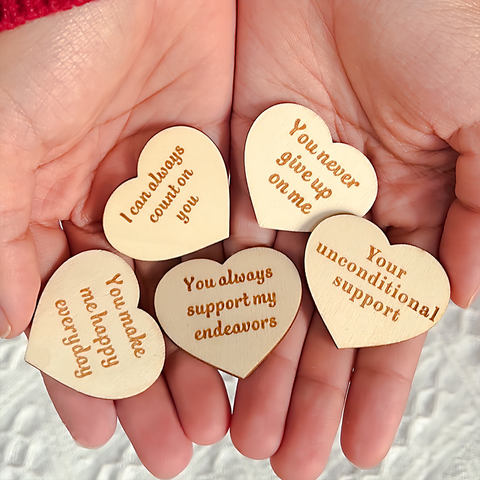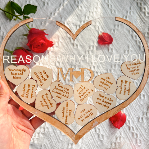 • 12 ENGRAVED HEART CHARMS: Unleash the power of words with 12 intricately engraved heart charms, each bearing a special reason why you love your significant other. You can choose the cozy wooden charms or colorful bright charms. Personalized and meaningful, these messages create a touching narrative of your unique connection.